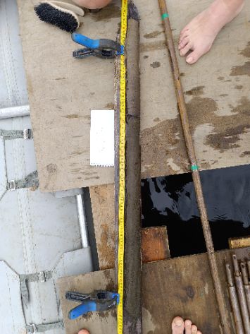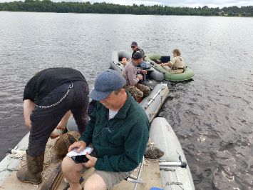 - 16 июля проведены полевые работы на озере Лавкозеро. Со специальной плавучей платформы при помощи торфяного бура (Russian Corer) с длиной пробоотборной части 1 м и диаметром 5 см было отобрано 7 кернов из нижней части разреза (отбор полного разреза производился участниками проекта в 2021 году). Для отобранных кернов в полевых условиях было выполнено литостратиграфическое описание и их фотографирование. Произведена батиметрическая съемка озера при помощи эхолота.